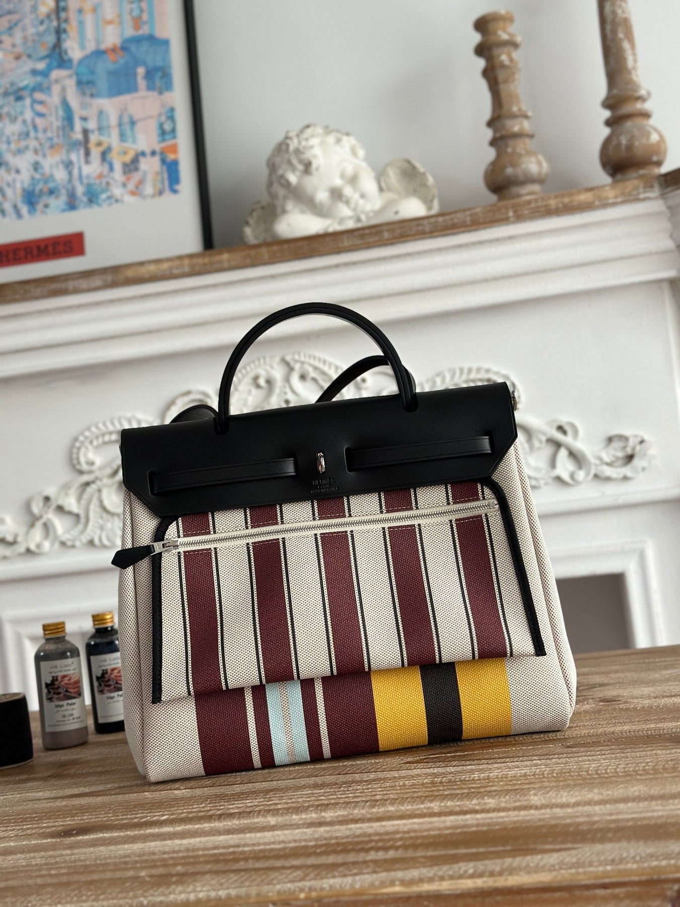 HERBAG ZIP 31 LAQUERED BAG IN BROWN MIX YELLOW H PLUME CANVAS